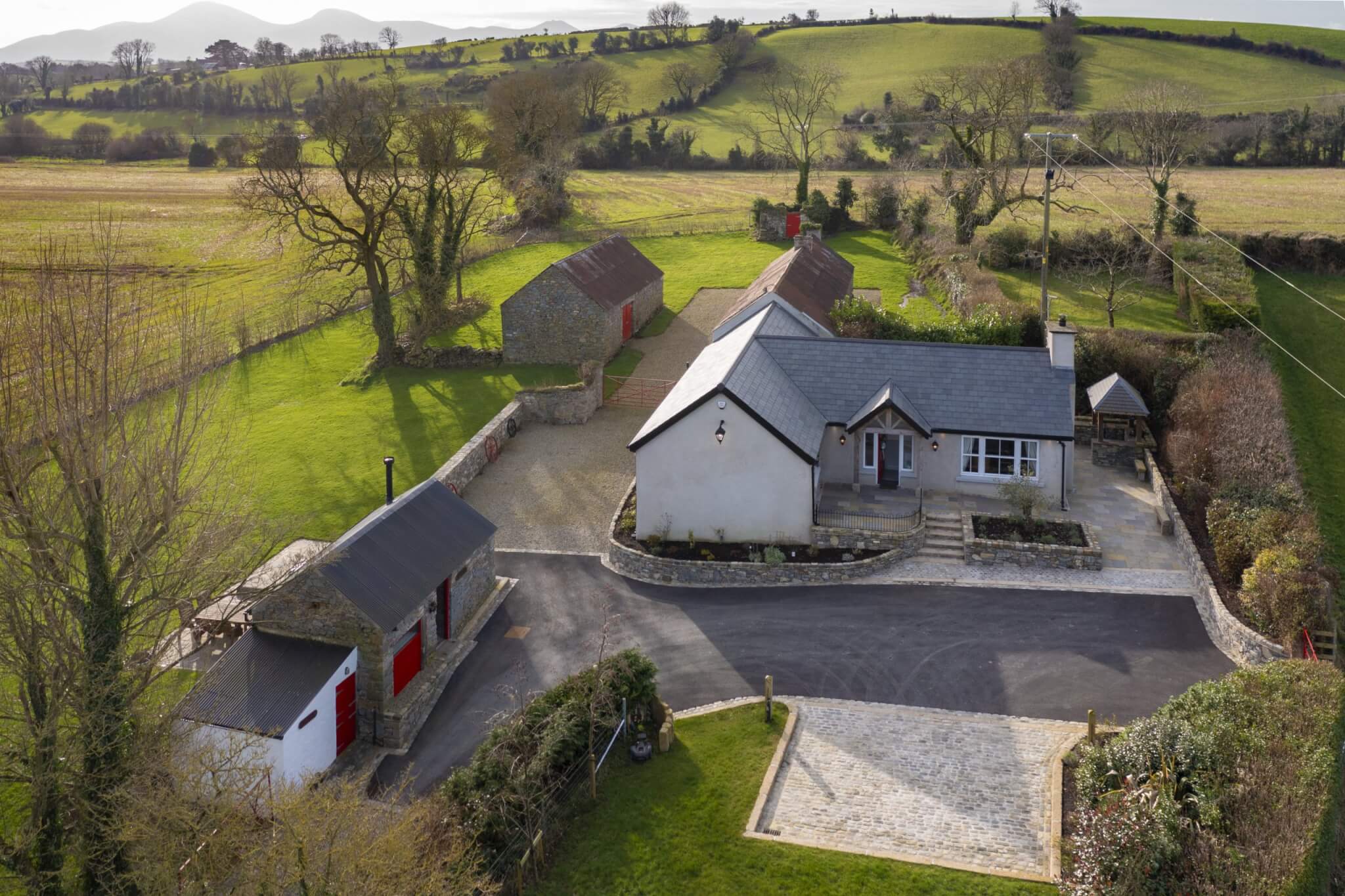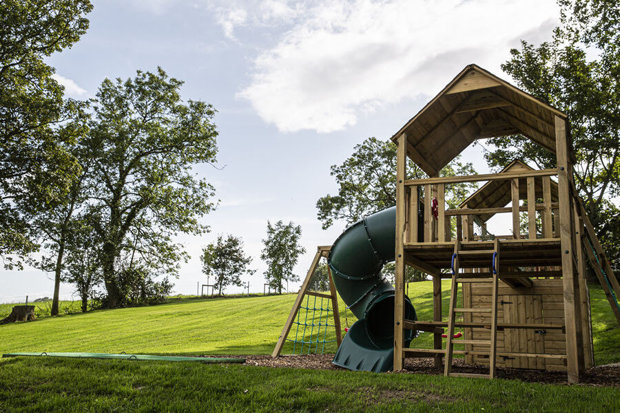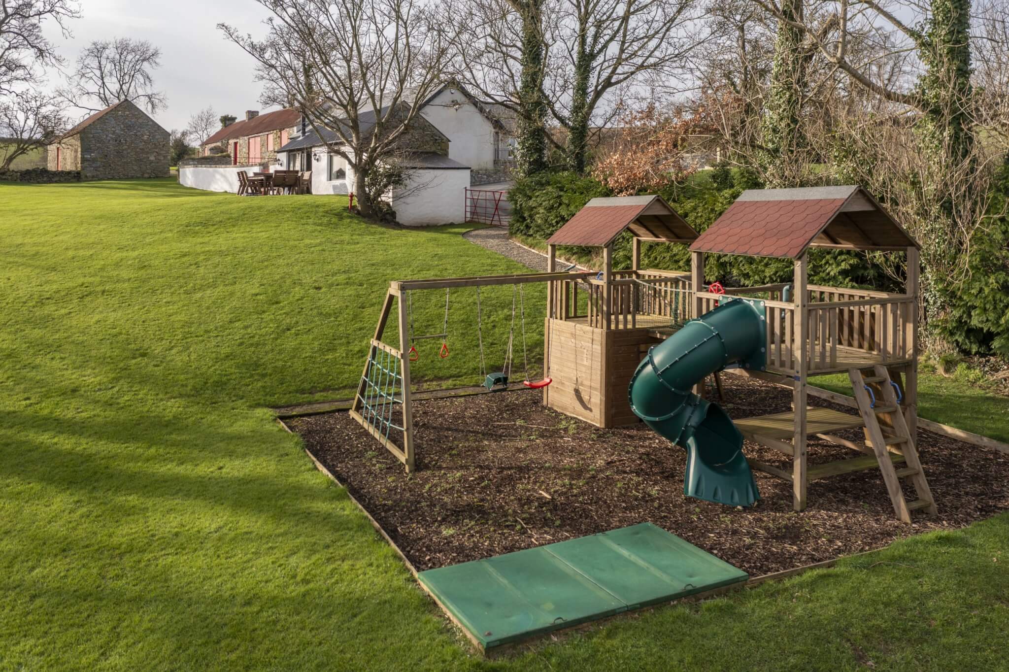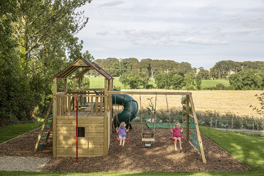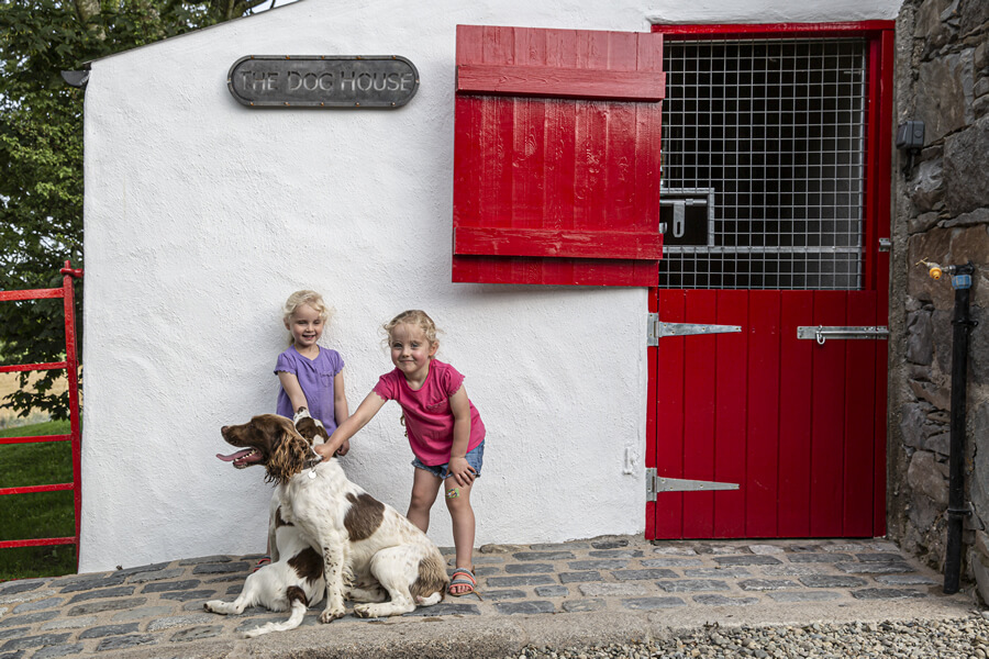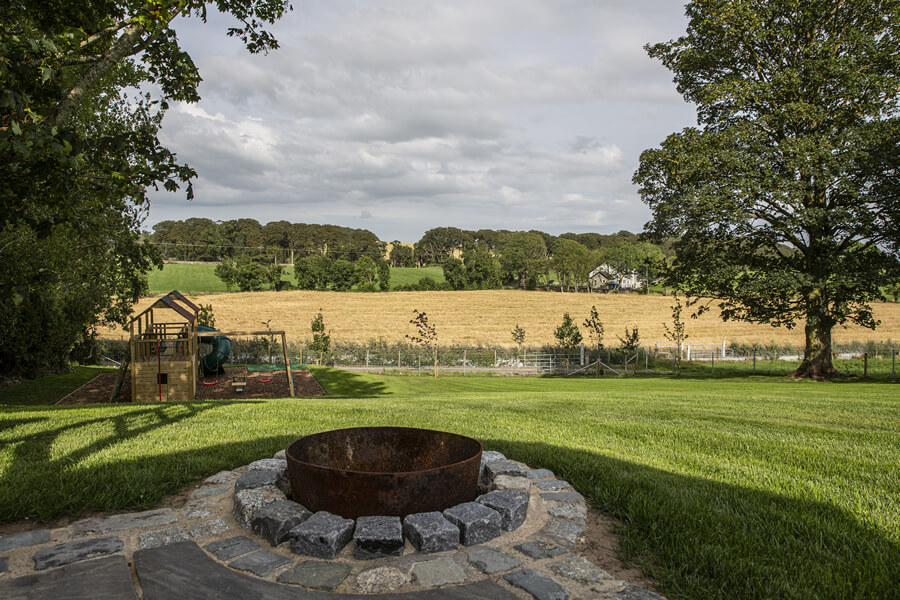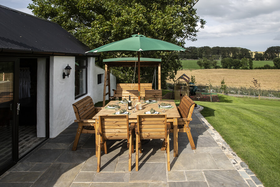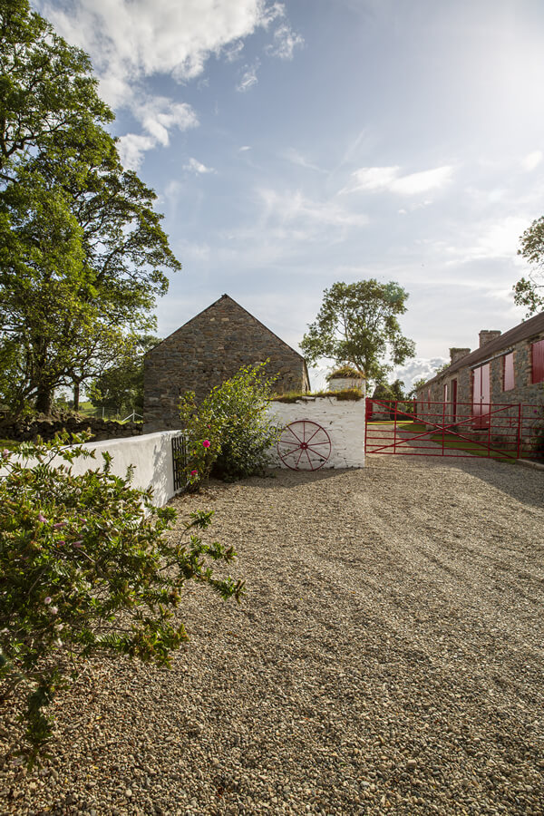 The Cottages have been fully refurbished in 2019, and many of the original site features have been sympathetically restored, including the Bakers Hole well. Beautiful granite kerbing entices you along the drive leading up to the fully restored Cottages. An idyllic location where tradition meets modern 5* awarded accommodation. The Bakers Cottages has it’s own private wild flower gardens, sweeping towards the restored well. On the other side of the cottages boasts a covered BBQ area. Then meandering across the gardens and courtyard leads to the hot tub house, with it’s 6 seater tub. This building also offers a cosy sitting area with a wood burning stove, double patio doors lead to an outdoor dining area overlooking the tranquil rolling hills, with the Mourne Mountains in the distant background. The perfect setting to relax and enjoy the sunset. An outdoor play area for the children is located just to the left of this outdoor living space, and the dog building is also here, allowing your whole family to enjoy making memories at The Bakers Cottages.