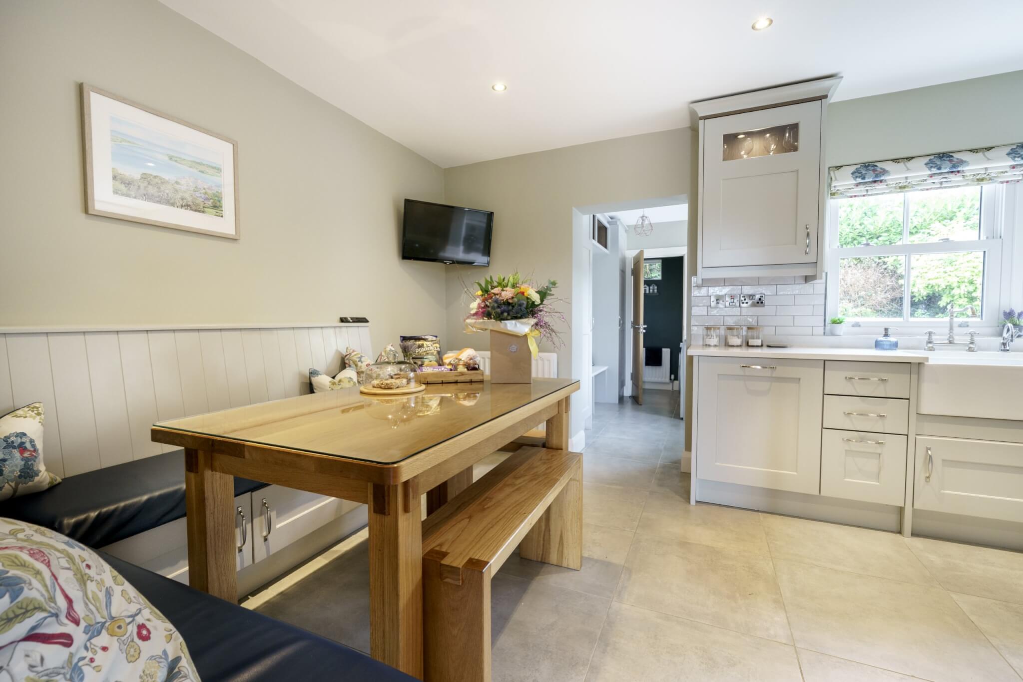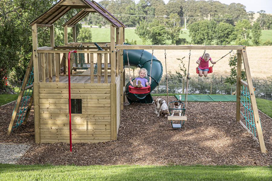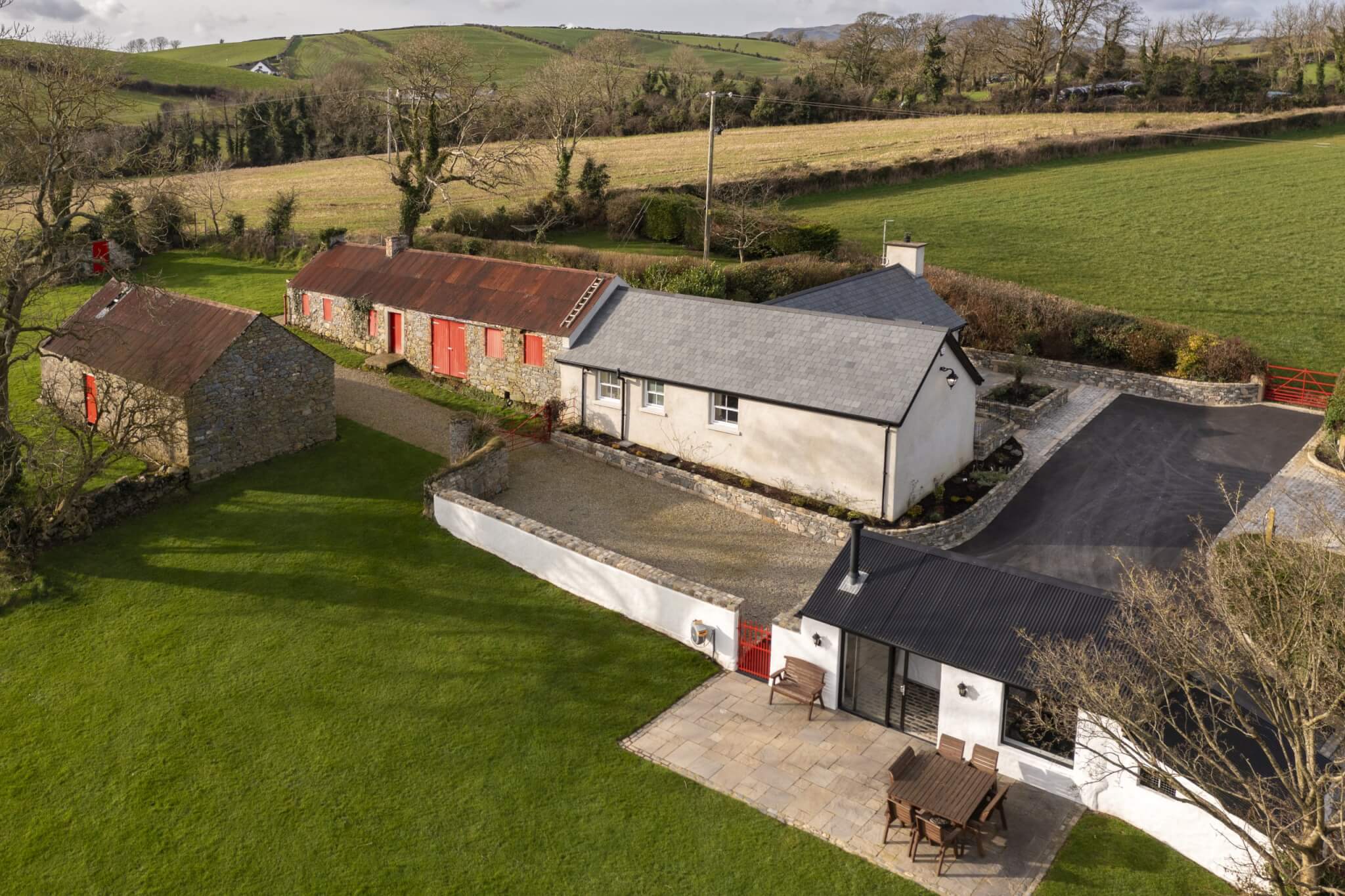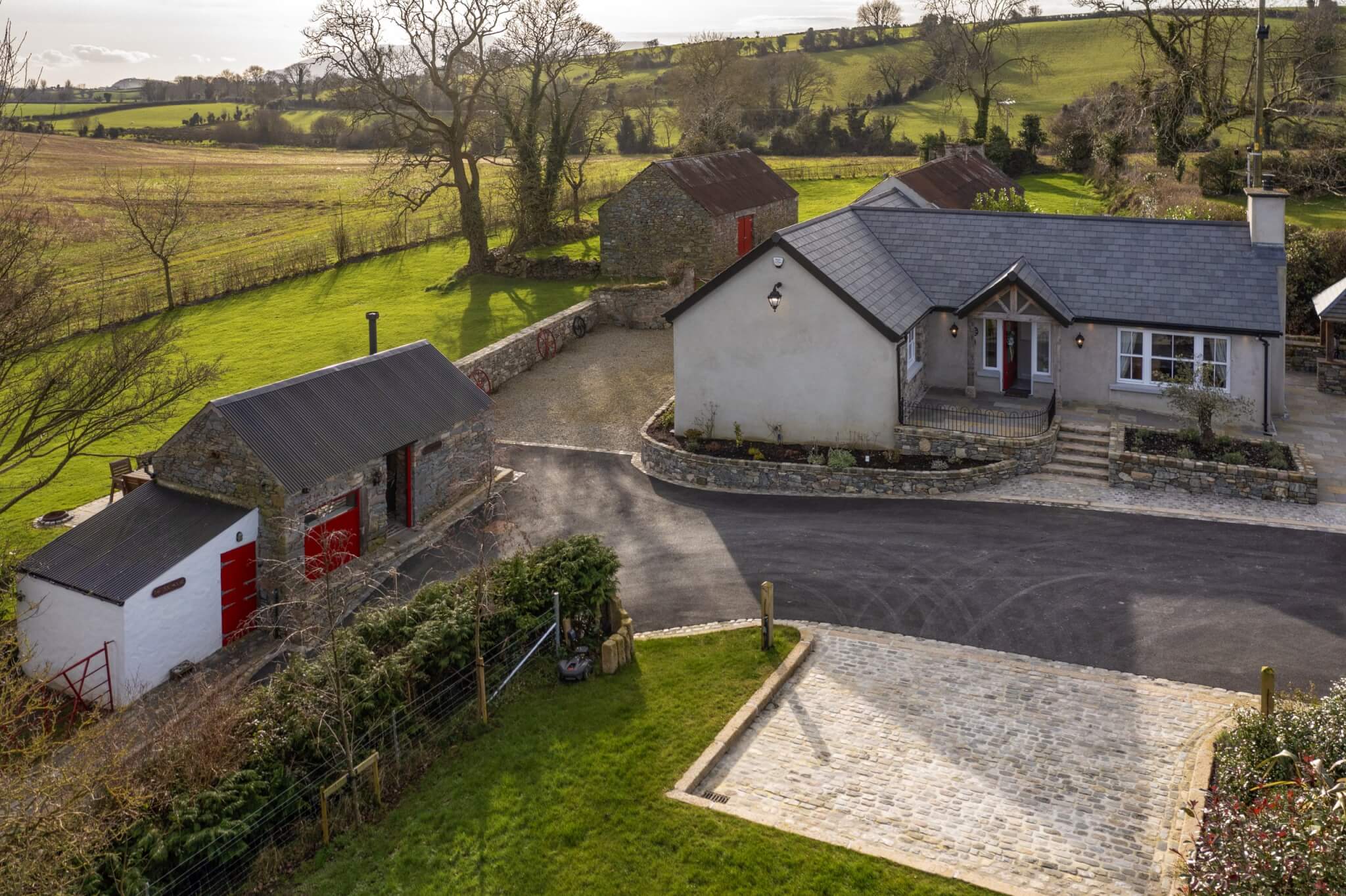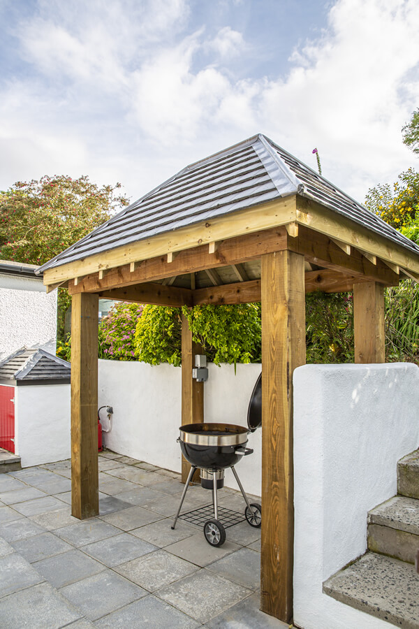The Cottages have been fully refurbished in 2019, and many of the original site features have been sympathetically restored, including the Bakers Hole well. Beautiful granite kerbing entices you along the drive leading up to the fully restored Cottages. An idyllic location where tradition meets modern 5* awarded accommodation. The Bakers Cottages has it’s own private wild flower gardens, sweeping towards the restored well. On the other side of the cottages boasts a covered BBQ area. Then meandering across the gardens and courtyard leads to the hot tub house, with it’s 6 seater tub. This building also offers a cosy sitting area with a wood burning stove, double patio doors lead to an outdoor dining area overlooking the tranquil rolling hills, with the Mourne Mountains in the distant background. The perfect setting to relax and enjoy the sunset. An outdoor play area for the children is located just to the left of this outdoor living space, and the dog building is also here, allowing your whole family to enjoy making memories at The Bakers Cottages.